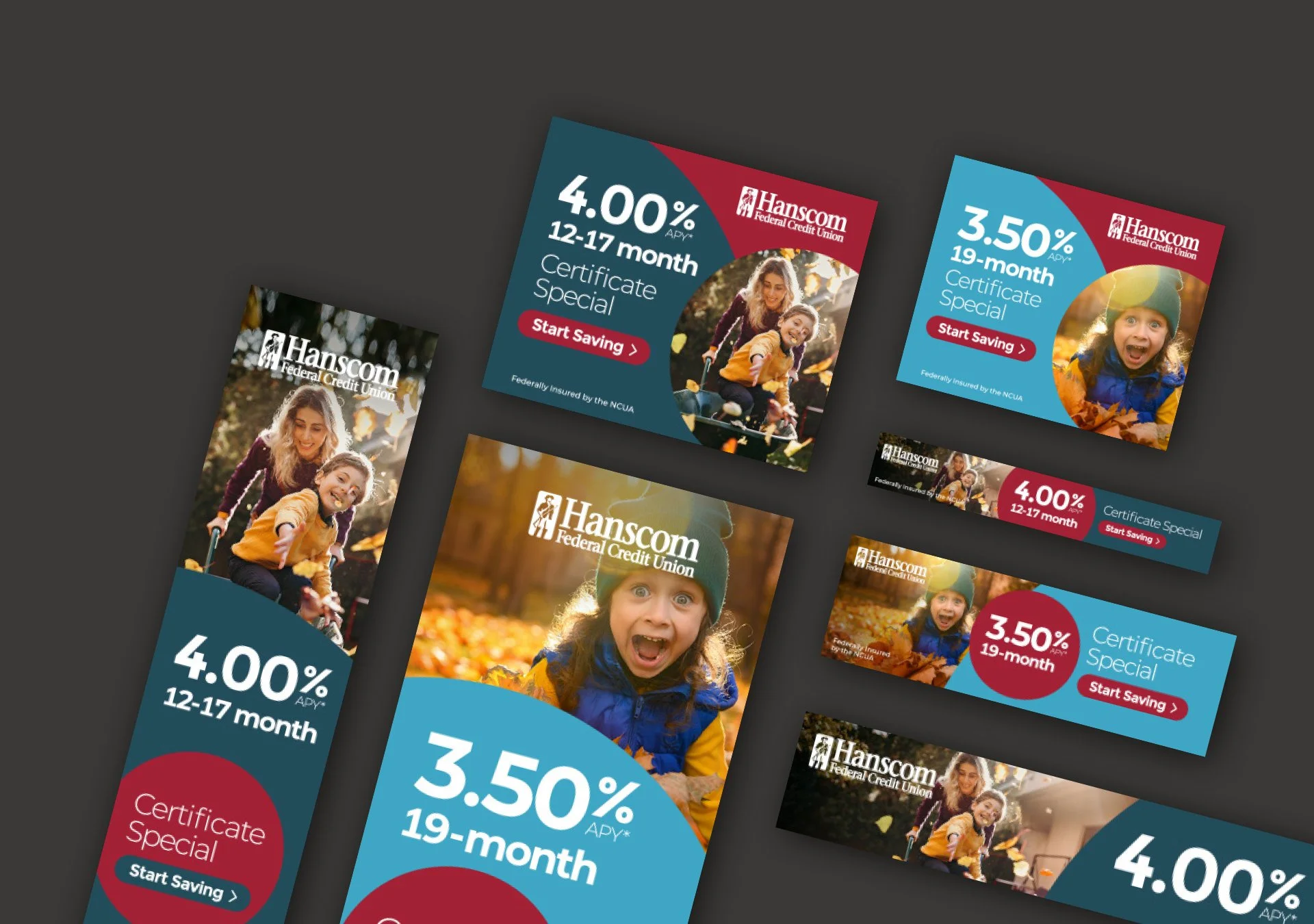 Using Hanscom’s updated brand we created display ad campaigns for both mobile and web sizes When budget permitted we delivered animated ads to draw even more attention to great rates and service offers.