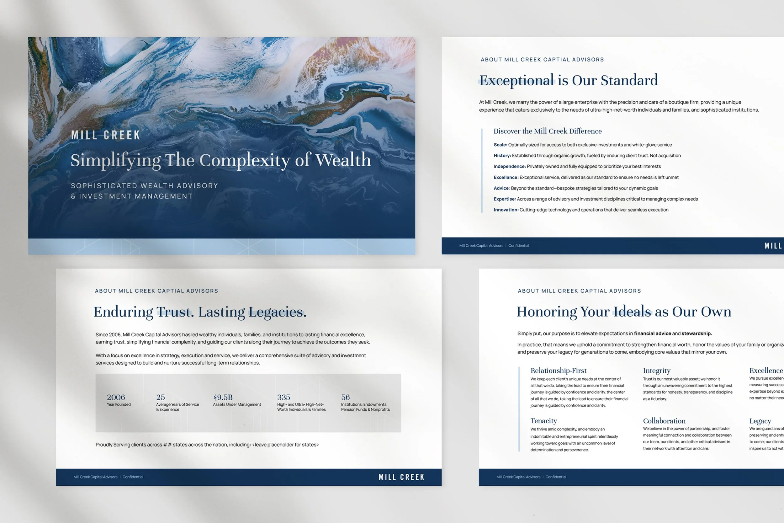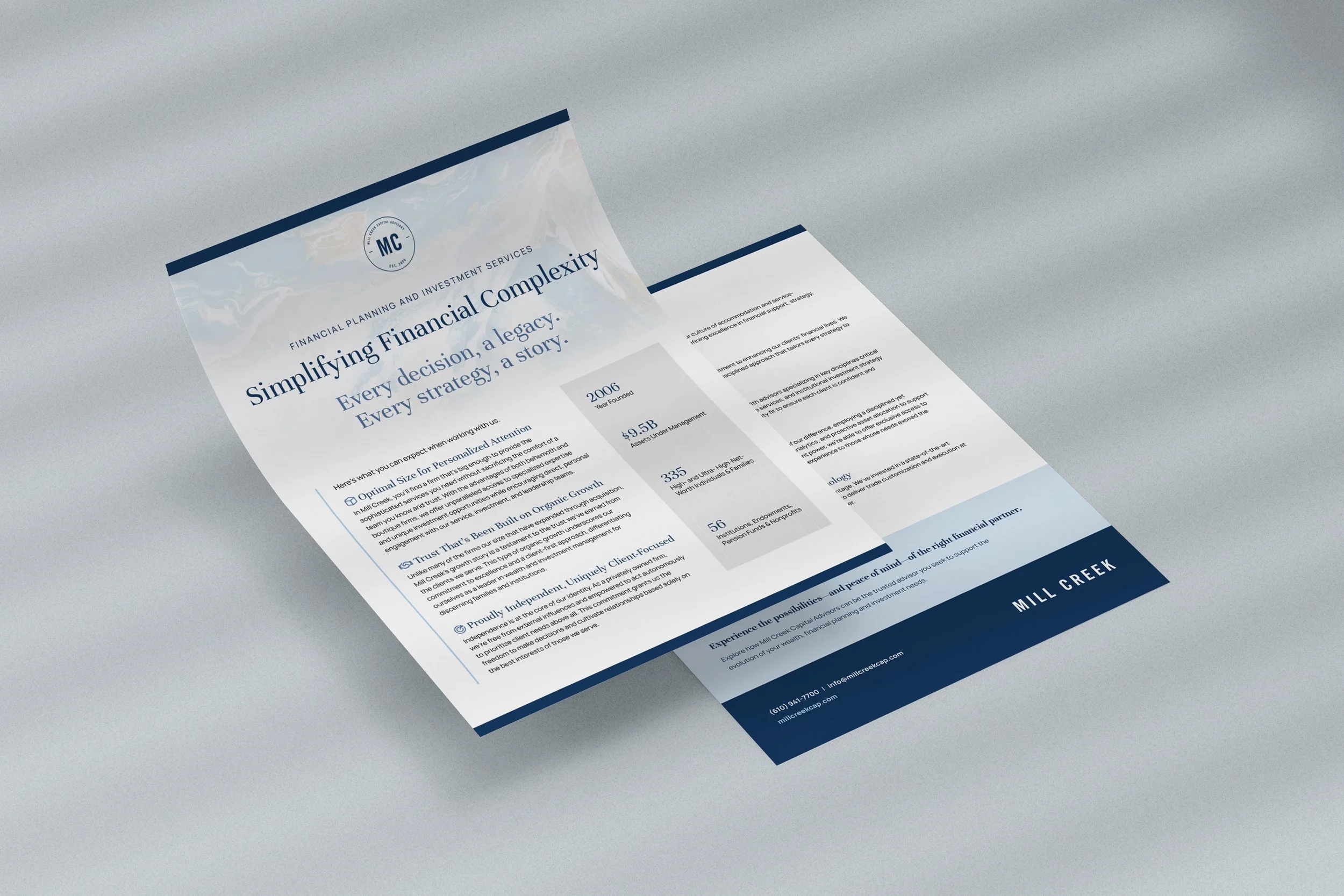Mill Creek’s brand centers on custom acrylic pour artwork, creating a sense of refined, modern sophistication. Each deliverable is carefully polished, resulting in a cohesive visual system that resonates with their client base.